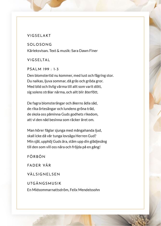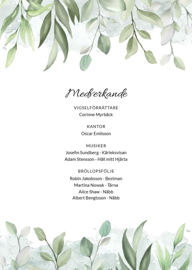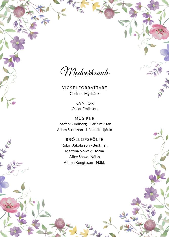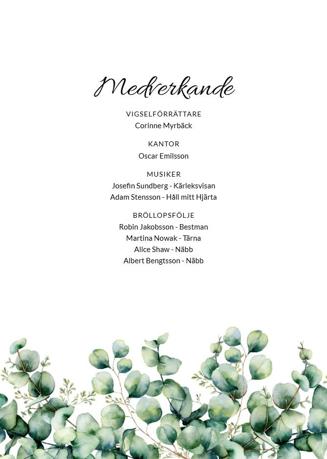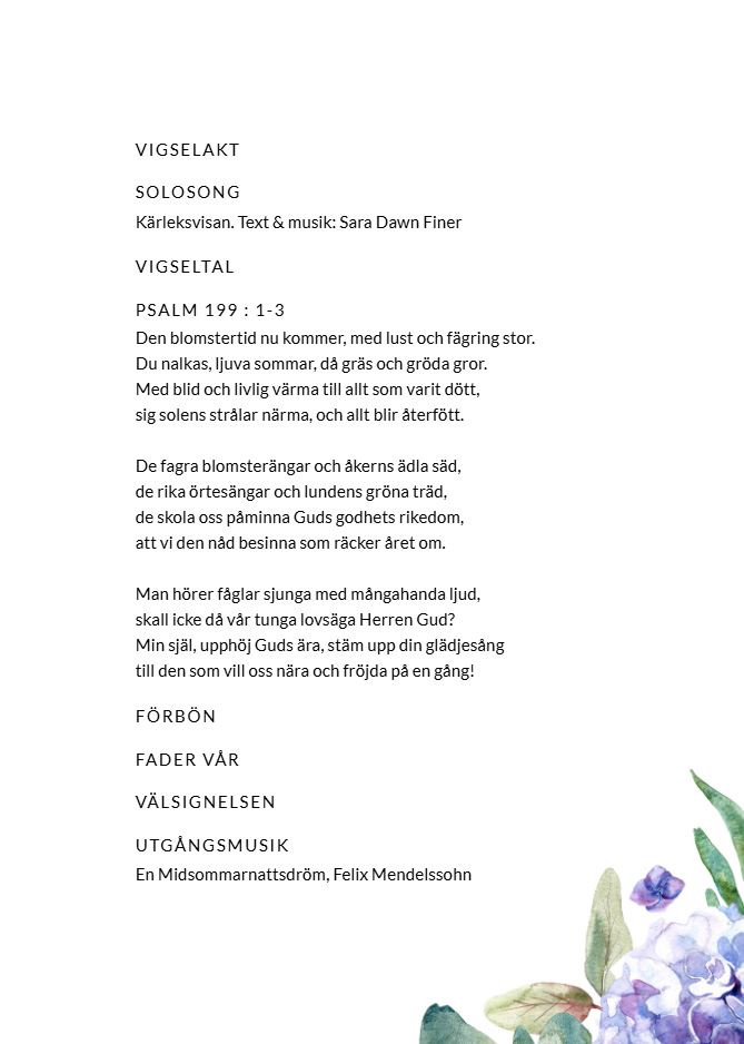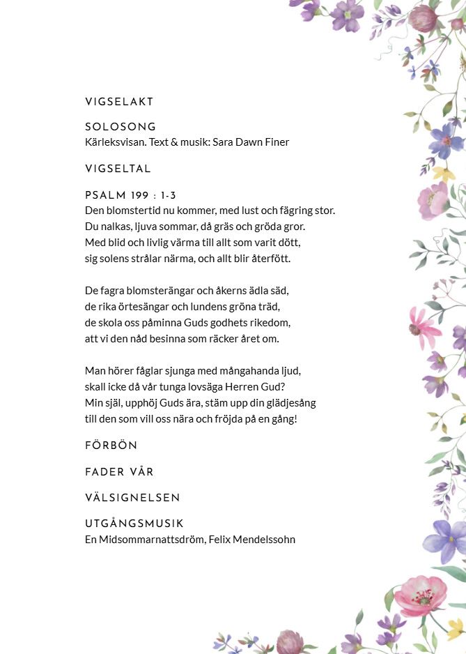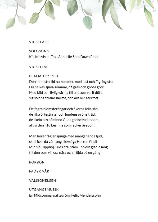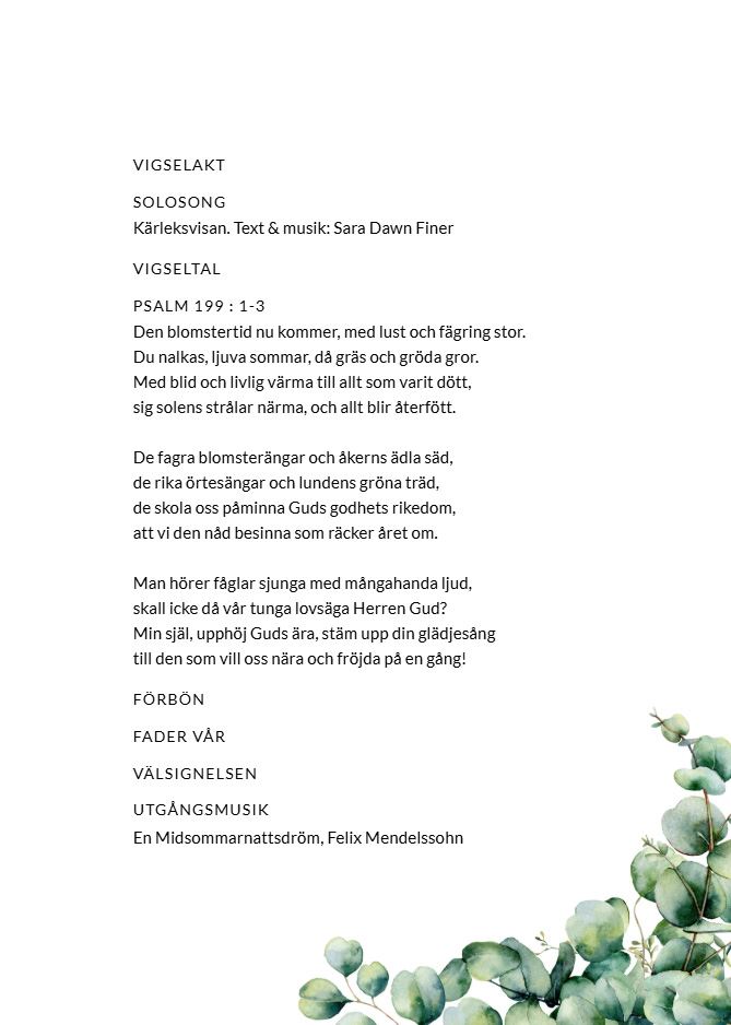 Med ett vigselprogram kan gästerna se vad som kommer att hända och det är samtidigt en presentation av vigselförrättare/präst samt andra som medverkar i vigselakten. Gifter man sig i kyrkan slipper gästerna bläddra i psalmböcker då all info kan finnas i vigselprogrammet.