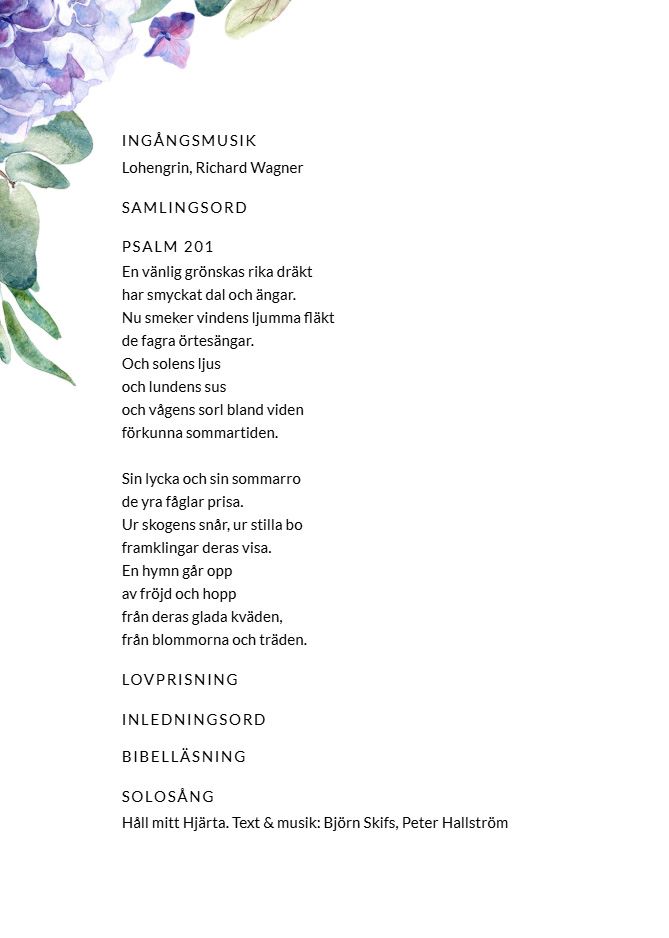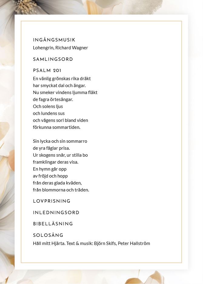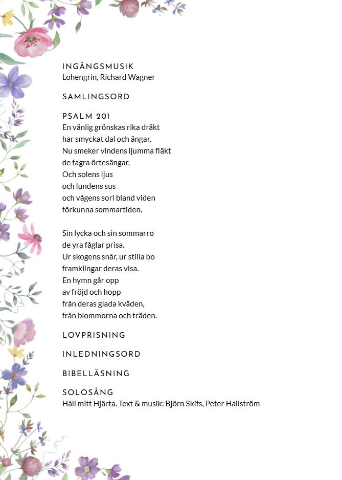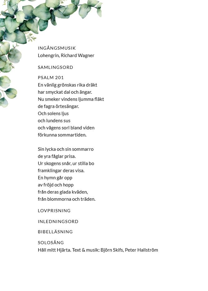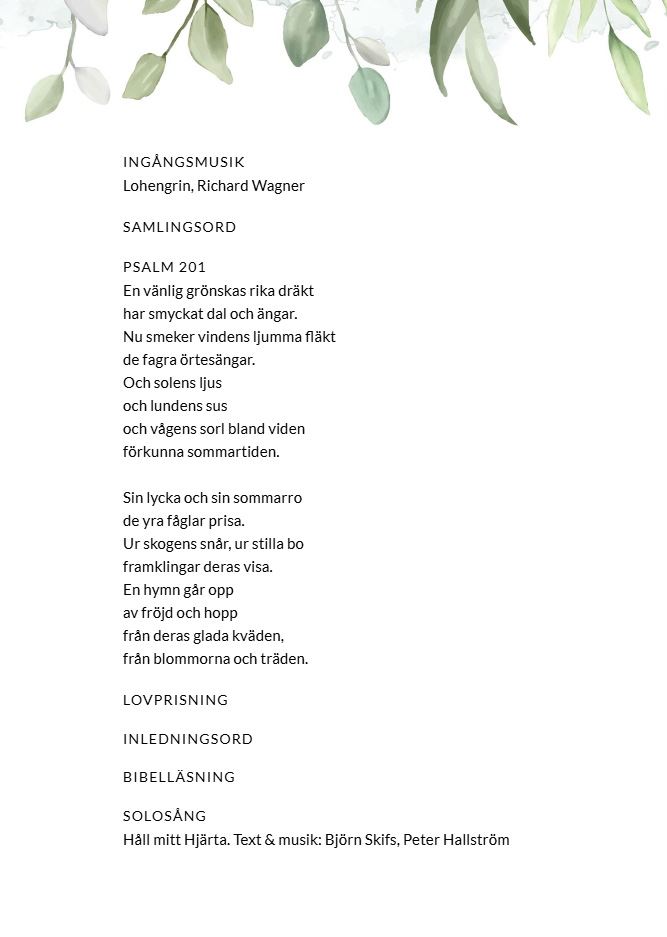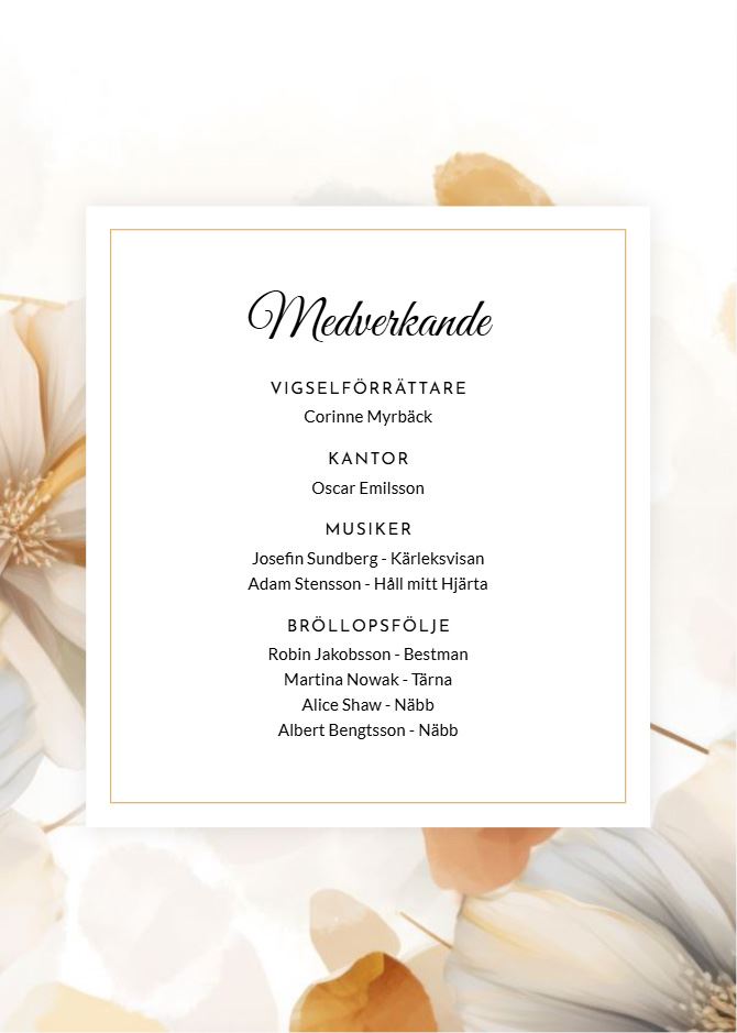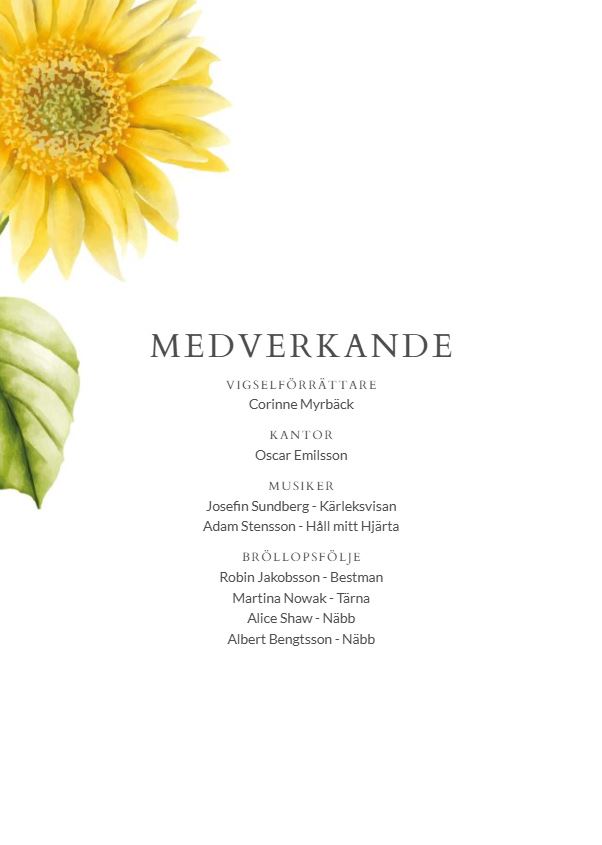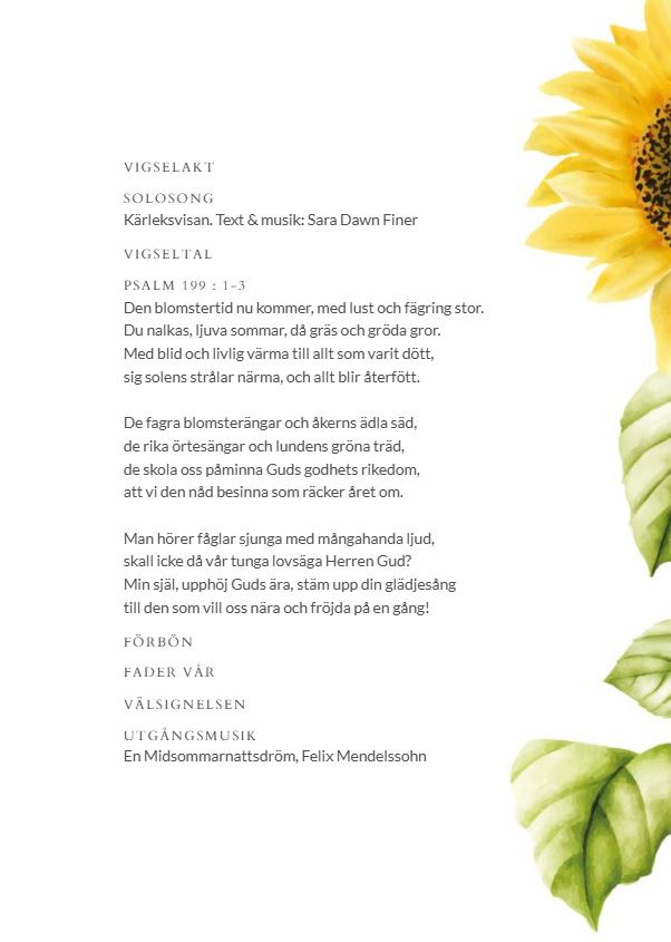 Med ett vigselprogram kan gästerna se vad som kommer att hända och det är samtidigt en presentation av vigselförrättare/präst samt andra som medverkar i vigselakten. Gifter man sig i kyrkan slipper gästerna bläddra i psalmböcker då all info kan finnas i vigselprogrammet.